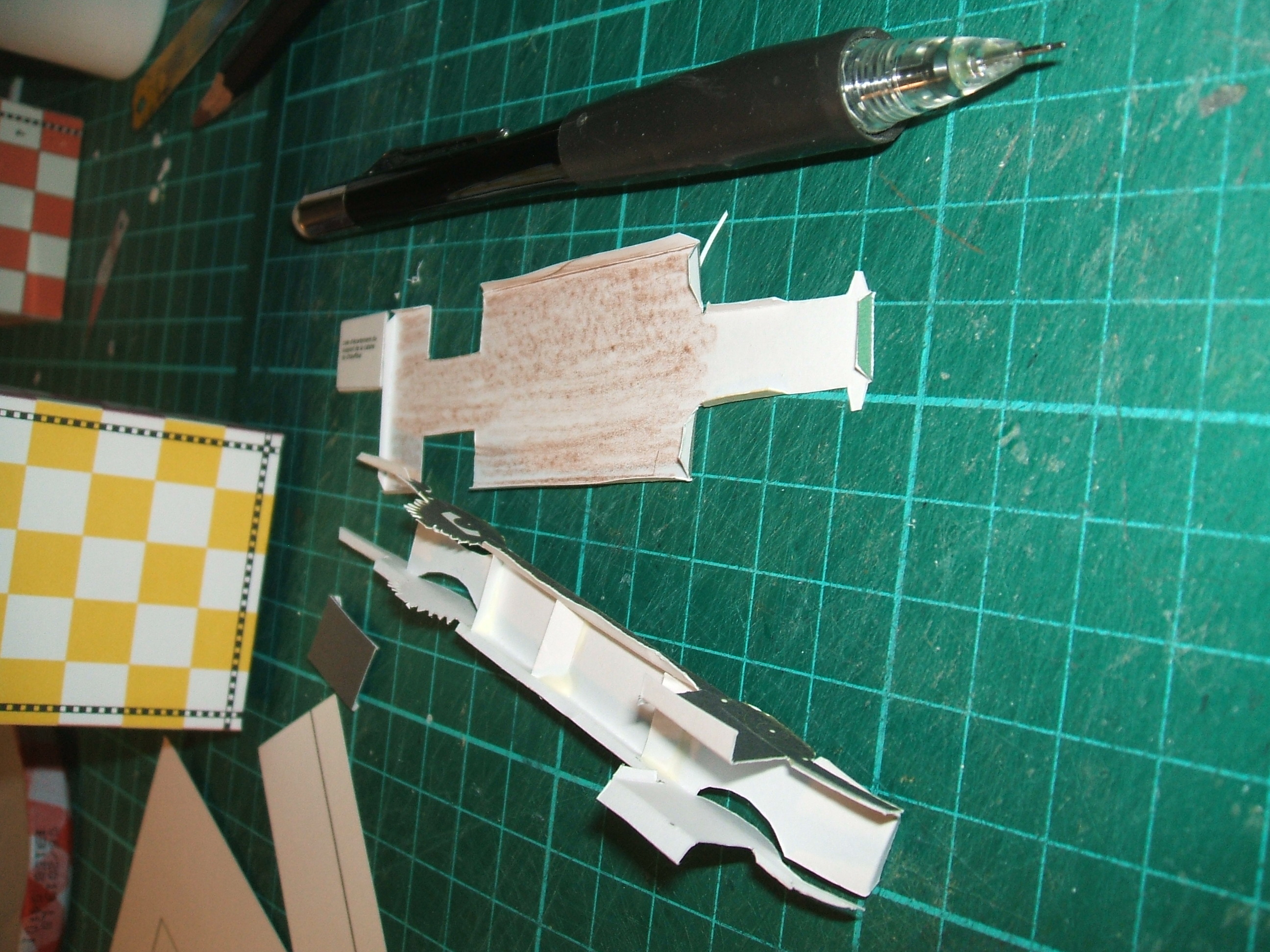 À ce stade, j'ai collé le plancher de la plateforme après avoir marqué ses plis . Il faut réduire un peu les languettes sur le côté. On voit les marquages qu'il faudra percer pour mettre les barres plus tard Je continue dans un instant