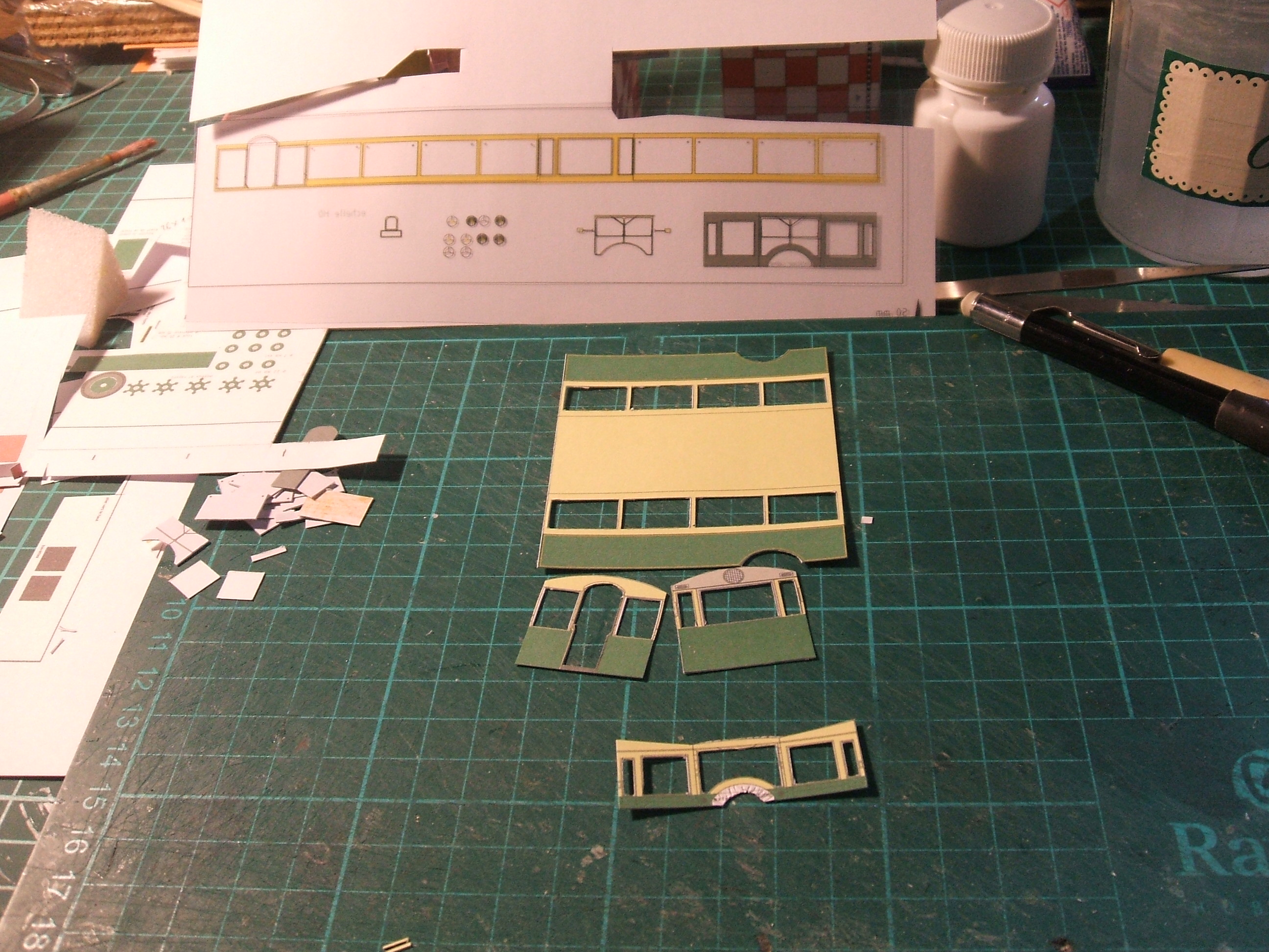 Voici la planche des vitrages, elle fait pour le 43 ème et le 87 ème. Je n'ai pas beaucoup de transparents pour jet d'encre, alors j'optimise. Pour nous c'est l'encart "échelle H0" qui nous intéresse. J'ai tout dessiné d'un seul tenant mais il faut les séparer. Collage sur le carton avec de la uhu colle tout qui ne blanchit pas le transparent On installe nos confortables sièges. Si quelqu'un peut nous publier un plan de l'aménagement, on pourrait faire mieux. Je sais juste qu'ils ne dépassent pas du bas des fenêtres! Voici les quatre côtés de la caisse découpés pour recevoir leurs vitres. L'intérieur est colorié au crayon de couleur, ce qui laisse transparaître le blanc du papier et rend l'intérieur très lumineux. Comme ça, on peut voir tous les défauts! Voici les vitres collées. En cherchant bien on voit les petits champignons de manœuvre des vitres. Bien faire en sorte qu'on puisse marquer les plis sans abîmer nos surfaces transparentes toutes neuves. Le zig zag bizarre est la séparation de classes. On y suspendait parfois des choses, voire un vitrage. La caisse commence à se coller. J'ai enlevé toutes les languettes. Je n'arrivais pas à avoir une précision suffisante pour coller les petites pièces. On met en forme le toit, on plie les hauts de caisse puis on colle le haut des cloisons avant et arrière. Quand ce sera sec, on montera la caisse béante sur le châssis puis on rabattra les côtés et on les collera en même temps sur le bas de caisse. Ce sera l'objet d'un message ultérieur.
