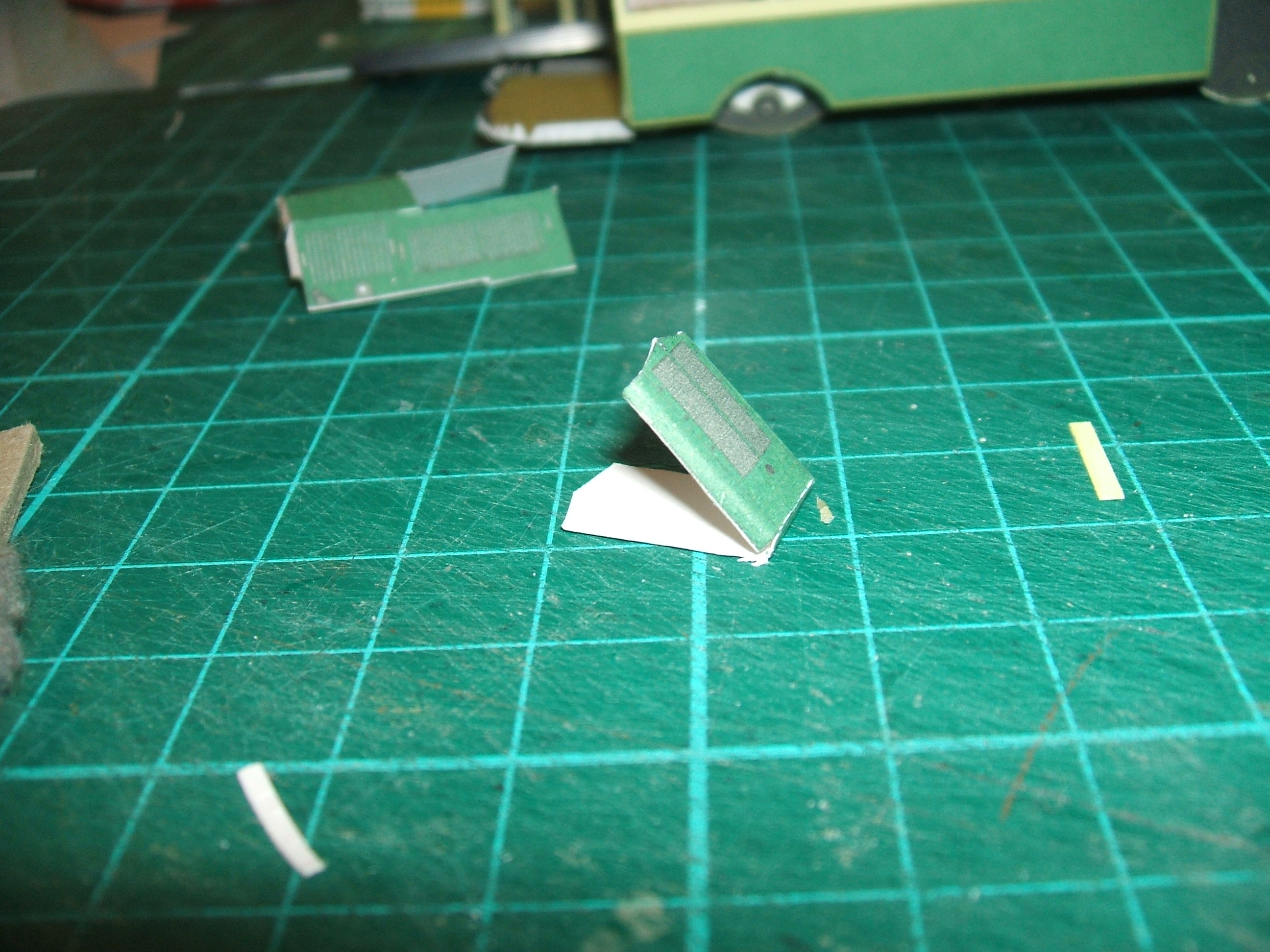 4 mm (support), 4 mm (siège), 5mm (dossier); on replie 5 mm (dossier), 4 mm (siège), 3 mm (support) et on recommence. Crayon de couleur et ensuite un peu de gouache? Le bas est gris, les sièges marron-roux, mais je crois qu'il y avait plusieurs couleurs. Pour la répartition, voyez les photos qui vont suivre. Et leur montage ; rien de plus simple. Je mettrai des accoudoirs si j'en refais un un jour. Voici une photo avec le réglage de la position des banquettes. La séparation première/deuxième classe est sur le deuxième trait en partant de la droite. Avec les 5 places du premier rang, on avait 17 "premières". noter le renfort de support de cabine du chauffeur