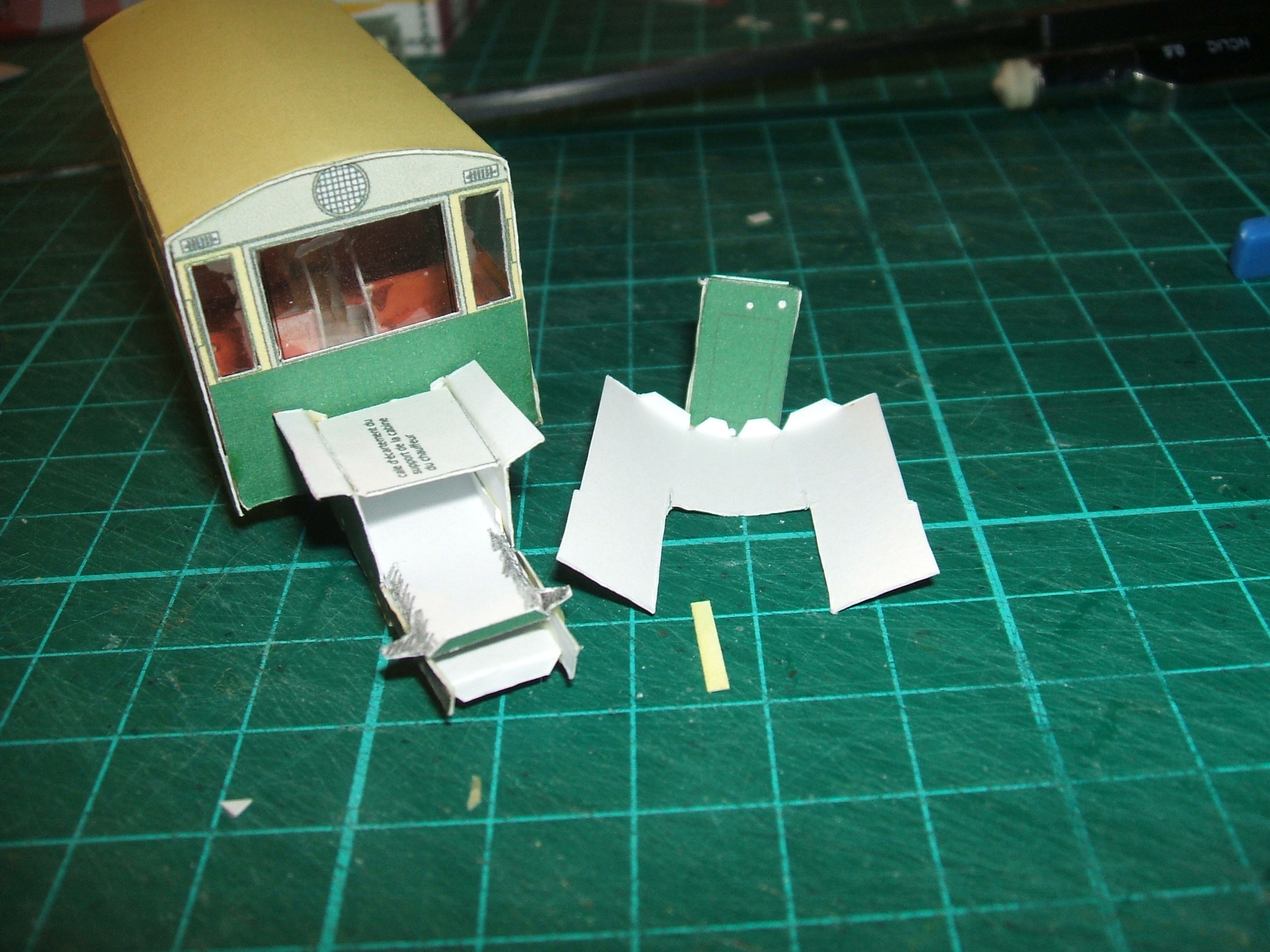 Voici l'état des travaux posé sur une partie de la planche des roues, collée sur du carton. La pièce courbe sur le pare brise est ratée. J'ai essayé de la faire en 80g imprégné de colle, mais c'est trop fin et ne marche pas. Je l'ai refaite peu après. Les montants du pare brise devraient être crème. Si vous voulez vraiment le faire, vous changez la couleur sur le transparent et soit vous rapportez une deuxième couche sur la première soit vous faites toute la cabine en crème, soit vous découpez des montants couleur crème dans du 80g ou du crépon et vous collez ça sur le pare brise. arrgh... Voici la vue de devant; la pièce de raccord en 160g est pliée au centre et renforcée avec un peu de 80g et collée en haut et en bas avec l'angle voulu (ou à peu près). On laisse bien sécher. J'aurais pu rapporter un écran derrière le siège du chauffeur. On voit trop bien la caisse et ses fauteuils. Le chauffeur pourrait être distrait. Je continue bientôt. Les photos sont bien plus grosses que le modèle!