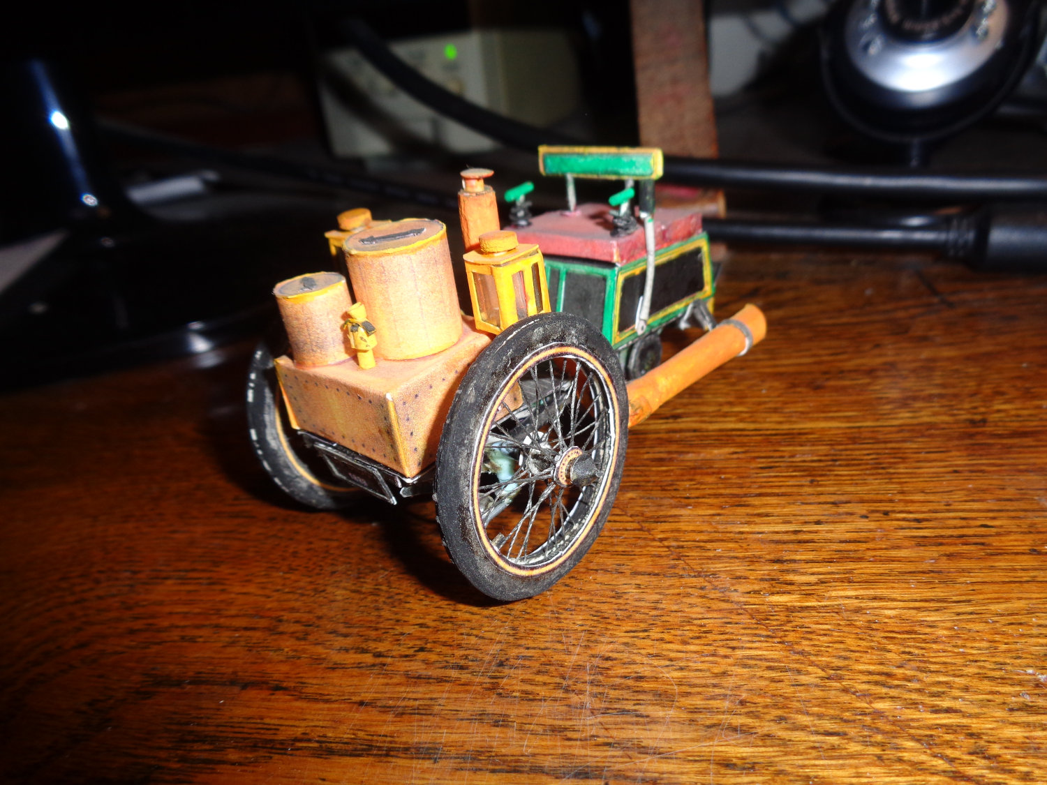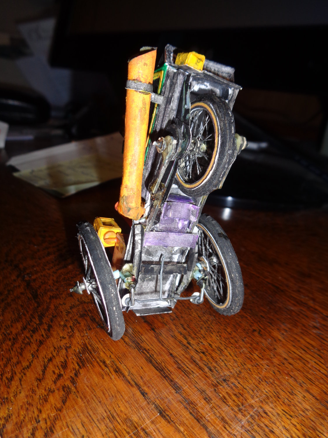 Le modèle doit avoir au moins dix ans et n'est pas vernis. les rayons sont en fil à coudre (coton n°40). Je conseillerai plutôt du lin, voire de la soie maintenant. Les roues sont en carton hormis les rayons et les axes (métal). Je n'ai pas fait de montage en images pour celle ci, j'étais en vacances et sans moyens informatiques! J'en ai fait huit et tu me donnes envie de continuer!