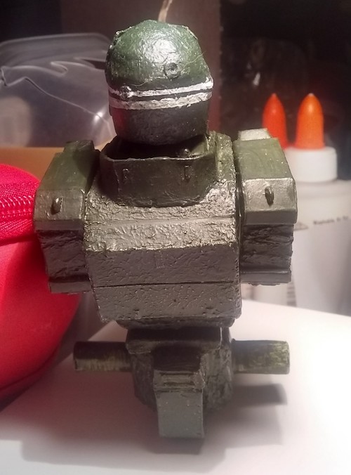 I then sealed the model and then stippled some thick gesso onto the torso. Once dried, I sanded it down to look like cast iron. It was then premiered and painted with olive drab.