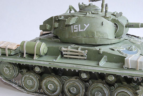 J'ai utilisé du papier Bristol mat et du papier ordinaire ( imprimante ) pour conserver l'apect mat de la couleur du char. ( en revanche pour les voitures types Aston Martin DBR 9, j'utilise du papier photo brillant pour le rendu brillant de la carosserie ).