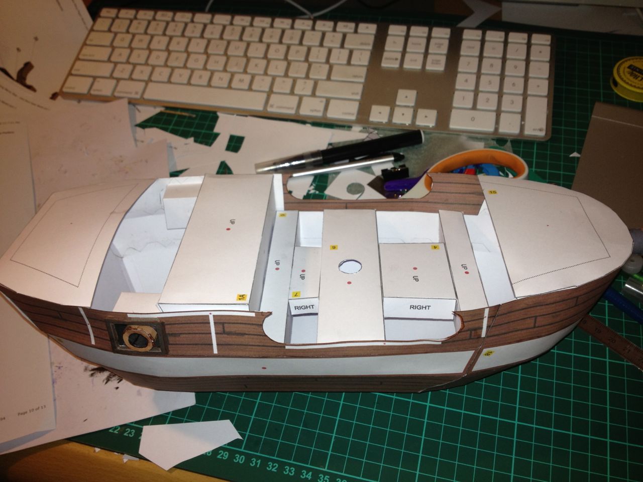 A noter que sur la photo on voit bien le résultat de ma bourde sur le positionnement de la structure interne, celle ci dépasse nettement du bastingage sur une vue tribord du bateau.